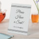 Dieses elegante Design mit der Meldung "Bitte haben Sie Platz!" Es verfügt auch über eine individuell anpassbare beruflich/klinisch/geschäftlich/organisatorisch/etc. name. Dies könnte in einem Empfang- oder Sitzbereich genutzt werden, um Kunden oder Kunden darüber zu informieren, dass sie in Kürze begrüßt werden und in der Zwischenzeit einen gewartet Sitzplatz einnehmen sollen.