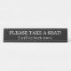 Dieses berufliche Design beinhaltet neben der Meldung "BITTE SITZ NEHMEN!" auch die Meldung "Ich bin bald wieder da!". Dies kann in einem gewartet Raum oder einer Sitzecke verwendet werden, um Patienten, Besucher oder Kunden darüber zu informieren, dass sie in Kürze bedient werden und bis dahin einen Platz einnehmen sollten.