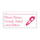 Dieses opulente Gummi Briefmarke Design beinhaltet neben der Nachricht "Bitte überprüfen, korrigieren, initial, und zurückgeben" auch eine Zeile, die eine Signatur oder Initialen schreiben könnte. Es könnte vielleicht von einem Erzieher oder einem administrativen berufliche genutzt werden, um zu verlangen, dass jemand den Inhalt eines Dokuments überprüft und anerkennt.
