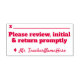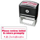 Dieses Design aus Gummi beinhaltet die Briefmarke "Bitte überprüfen, starten und sofort zurückgeben", sowie eine Zeile, in der eine Signatur oder Initialen geschrieben werden kann. Es enthält auch den Namen eines personalisierten Lehrers oder Lehrers. Es könnte von einem Lehrer, Erzieher oder Tutor genutzt werden, um zu verlangen, dass die Eltern eines Schülers die Arbeit eines Schülers auf einem Test, einem Papier oder einem anderen Auftrag überprüfen.