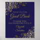 Dieses elegante Poster oder Schild lädt die Gäste dazu ein, Ihr Hochzeitsgast-Buch zu unterschreiben. Es zeichnet sich durch ein schlichtes und dennoch elegantes Design aus, mit Goldtext auf marineblarem Hintergrund und schmucklosen goldenen Imitaten in den Ecken.