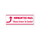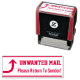 Dieses Design aus Gummi-Briefmarke enthält die Meldungen "Bitte zurück zum Sender!" und "UNWANTED MAIL", zusammen mit einem verbogenen Pfeilsymbol. Es kann verwendet werden, um anzugeben, dass die empfangene Post an die falsche Adresse oder an einen unbekannten Empfänger geliefert wurde, und sollte an den Absender zurückgeschickt werden.
