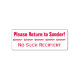 Dieses Design aus Gummi-Briefmarke enthält die Ausdrücke "Bitte zurück zum Sender!" und "Kein Empfänger" sowie ein dekoratives Pfeilsymbol. Es kann verwendet werden, um anzugeben, dass die empfangene Post an die falsche Adresse geliefert wurde, und sollte an den Absender zurückgeschickt werden.