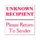 Dieses Briefmarke-Design beinhaltet die Botschaften "Bitte zurück zum Sender" und "UNBEKANNTER EMPFÄNGER". Es kann verwendet werden, um anzugeben, dass die empfangene Post an die falsche Adresse geliefert wurde, und sollte an den Absender zurückgeschickt werden.