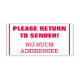 Die Briefmarke aus Gummi enthält die Botschaften "BITTE RÜCKKEHR AN SENDER!" und "KEINE SOLCHE ADRESSE". Es könnte verwendet werden, um anzugeben, dass die empfangene Post falsch adressiert worden sein könnte, und sollte an den Absender zurückgeschickt werden.