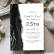 The left-hand edge of this elegant modern wedding anniversary party invitation features a black watercolor agate border trimmed with silver faux glitter. The customizable text combines charcoal gray handwriting, copperplate and italic fonts on a white background. The reverse side features a matching black and silver agate design.