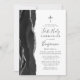 Der links Rand dieses eleganten, modernen First-Communion-Einladens besticht durch einen schwarzen Aquarellrand, getrimmt mit Imitaten silbernen Glitzer. Über dem anpassbaren Text erscheint ein Imitat silbernes Folienkreuz, das Handschrift, Copperplate und kursiv Schriftart in Holzkohlegrau auf weißem Hintergrund kombiniert. Auf der Rückseite ist ein passendes schwarz-silberfarbenes Design erkennbar.