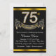 Elegante Diamantenzahlen und Banner schwarz und gold 75. Geburtstagsfeier Einladung. Diese schöne schwarz-goldene Einladung zum 75. Geburtstag ist für Ihre Veranstaltung leicht angepasst. Dieses auffallende Design funktioniert gut für einen Mann oder eine Frau.