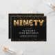 Moderne 90. Geburtstagseinladung mit einem stilvollen schwarzen Hintergrund, einer Streuung von Goldkonfetti, goldenen Helliumballons, die "neunzig" buchstabieren, und einer eleganten Party-Textvorlage, die leicht zu personalisieren ist.