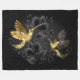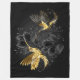 Schmuck aus schwarzem und goldenem Schmuck, der mit grauem Hintergrund und Pflanze geschmückt ist. Schmuckvögel. Goldener Vogel. Goldvogel.
