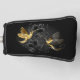 Schmuck aus schwarzem und goldenem Schmuck, der mit grauem Hintergrund und Pflanze geschmückt ist. Schmuckvögel. Goldener Vogel. Goldvogel.
