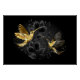 Schmuck aus schwarzem und goldenem Schmuck, der mit grauem Hintergrund und Pflanze geschmückt ist. Schmuckvögel. Goldener Vogel. Goldvogel.