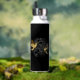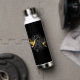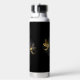 Schmuck aus schwarzem und goldenem Schmuck, der mit grauem Hintergrund und Pflanze geschmückt ist. Schmuckvögel. Goldener Vogel. Goldvogel.