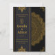Diese Einladung zur Hochzeit besticht durch ein luxuriöses Design mit schwarzem Hintergrund und aufwändigen Goldmustern, die die rechte Seite dekorieren, während elegante Blumenmotive oben und unten schmücken. Das schlichte Lavendelgoldenlogo und der dekorative Schriftart ergänzen die luxuriöse und raffinierte Ästhetik.