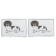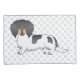 Desteis originelle Cartoon-Illustration einer niedlichen langen Haar schwarz und tan piebald Fell Farbe Dackel züchten Hund. Der Hintergrund weist ein Muster grauer Hundepfoten auf.