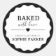 Add a homemade touch to your baked goods with this "Baked with Love from the kitchen of Sticker." Perfect for sealing cookie boxes, bread bags, or a gift jar. Features a scalloped edge, sweetheart divider, and a customizable name. Ideal for home bakers, small businesses, and kitchen gifts.