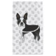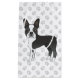Desteis originelle Cartoon-Illustration einer niedlichen Schwarz-Weiß-Farbe Boston Terrier Rasse Hund. Der Hintergrund weist ein Muster grauer Hundepfoten auf.