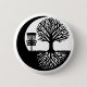 Disc golf themed button. Black and white disc golf basket and tree roots silhouette.