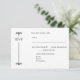 Ornamental black flourishes frame the top and bottom on the left, adding a formal touch that complements the minimalist design. The right side holds the details of the RSVP. The overall aesthetic is clean and timeless, ideal for a traditional or upscale celebration. The structured spacing and monochrome palette enhance readability and elegance. Personalize with your own information.