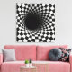 A tunnel-like optical illusion is created using a black and white checkered pattern, giving a dizzying sense of depth