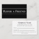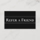Diese schwarz-weiße Referenzkartenvorlage enthält Text, den Sie bearbeiten können. Diese Empfehlungskarten haben Zeilen, um den Namen des Freundes und den Namen des Kunden zu schreiben, der die Bewerbung gemacht hat. Die andere Seite ist schwarz mit weißen Streifen, die über die Karte gehen. Der weiße Bildschirmtext zwischen den weißen Streifen sagt "Einen Freund vermitteln". Alle Texte können nach Belieben bearbeitet oder gelöscht werden. Die Imitate Golddetails sind Kunstwerke und nicht aus Folie.