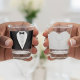 Schwarzer Anzug und Bowtie Schuss Glas für einen Bräutigam oder frisch vermählten Ehemann. Gutes Geschenk für eine Junggeselle. Nehmen Sie sich ein passendes Anzug-Schussglas für die Ehefrau des Bräutigams.