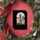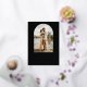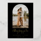 Eine moderne Hochzeitsankündigung mit Ihrem Foto in Bogenform und der Phrase "nichts extravagant, nur Liebe" unter der Folie auf schwarzem Hintergrund.