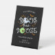 Boos & Booze Halloween Adult-Podest-Schild mit schwarzem Hintergrund, fliegenden Fledermäusen, einem strahlend blauen Geist, der durch "Boos" fliegt, einer Tasse schwindelnden grünen Schnaps mit rotem Augapfel und Stroh.