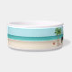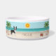 Desteis originelle Cartoon-Illustration einer niedlichen Schwarz-Weiß-Farbe Boston Terrier Rasse Hund stehend in einer tropischen Sommer Strand-Szene. Der beige Sand ist mit einer Palme, einer rosa Muschel, einem Seestern und einer roten Krabbe verziert. Das Wasser ist türkisblau mit einigen Wellen und die Sonne scheint über dem Horizont. Es gibt auch einen personalisierbaren Textbereich für einen Namen oder anderen benutzerdefinierten Text wie "Essen" oder "Wasser".