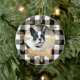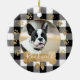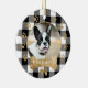 Fügen Sie Ihrem Weihnachtsbaum einen gemütlichen und warmen Charme hinzu, mit unserem Metallschmuck aus dem Foto Pet mit einem gemütlichen und warmen, schwarz-weißen Büffel-karierten Muster-Hintergrund. Circle Foto Rahmen mit einem festlichen Imitat goldener Bogen und Knochen. Passen Sie Ihren Haustiernamen und Ihr Foto an. Von Moodthology Papery entworfen