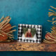 Rustikaler Bauernhof frische Weihnachtsbäume Familie Foto Sake-Plakette. Die Plakette kann mit dem Familiennamen, dem Jahr und dem Foto angepasst werden. Schwarzes Schachbrett karierter Hintergrund mit rustikalen Kiefern und Schneeflocken. Der Familienname wird in einem weißen Banner angezeigt. Kunst von Moodthology Papery.