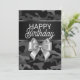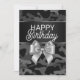 Benutzerdefinierte Geburtstagskarte mit "Happy Geburtstag" in gemischter Typografie, Silberbogen, schwarzem Satinband und schwarzem Camouflage-Hintergrund.