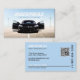 Black Car Rental Service Blue Business Card bietet eine malerische Sicht auf ein Auto, das mit der weißen stilisierten Typografie des Firmennamens übereinstimmt, während im Hintergrund die blaue Himmelsfarbe mit allen Details des Geschäfts reflektiert wird. Hinzu kommt ein QR-Code, der heute mit dem Marketing Trend behalten wird.