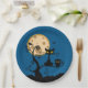 Schwarze Katze und schwarze Eule auf stilisierten Baum mit Fledermäusen und Vollmond auf blauem Hintergrund.
