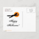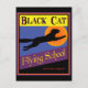 Custom Rücksendeadresse Happy Halloween Black Cat Flying School Retro-Postkarte mit einer magischen schwarzen Katze fliegt über einen unheimlichen blauen Himmel mit einem orangen Mond.