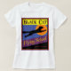 Black Cat Flying School Retro Halloween Art. Eine magische schwarze Katze fliegt über einen unheimlichen blauen Himmel mit einem orangefarbenen Mond. Vintages Halloween-Kunstdesign von AngelCityArt