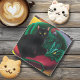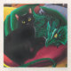 Schwarze Katze kuscheln auf einem bordeauxfarbenen Kissen neben anderen Kissen dahinter mit einem grünen Drachenfreund.