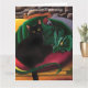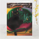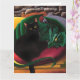 Eine niedliche schwarze Katze kuschelt auf einem bordeauxfarbenen Kissen mit einem grünen Drachen.