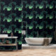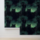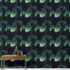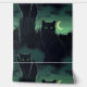 Eine schwarze, glänzende Katze mit leuchtenden grünen Augen, die auf einem Zaunpfosten sitzt und im Hintergrund einen Halbmond hat