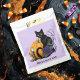 Eine schwarze Katze für Halbwal mit orangefarbenem Kürbis, Kerze, lila Rose und Herbstblättern in einem lila, hellen Rahmen im gotischen Stil.