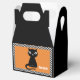 Schwarze Katze mit Curled Schwanz Halloween-Party Gefälligkeitsbox mit schwarzer Katze und schwarz-weiß Schachbrett (siehe dazu passende Küchen- und Speiseartikel und Party). Personalisieren Sie es, indem Sie einen Namen und/oder Ihren eigenen Text hinzufügen und die Bilder und den Hintergrund ändern. Wenn Sie kein Halloween-Gefälligkeitsfeld gewollt, entfernen Sie orangefarbenen Hintergrund und wählen oder beseitigen den Schriftart und es ist nur eine niedliche Katze mit schwarz-weißen Karos. Siehe Koordinieren von Designelementen, die Sie auch personalisieren und anpassen können.