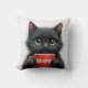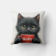 Ein flauschiges schwarzes Kätzchen mit großen grünen Augen hat eine hellrote Tasse mit dem Titel "Nope"