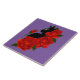 Eine schwarze Katze mit rote Rosen im Hintergrund lila
