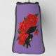 Eine schwarze Katze mit rote Rosen im Hintergrund lila