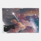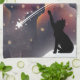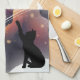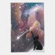 Diese Weltraum-Illustration erscheint etwas surreal mit Wolken in blau, rosa, lila und gelb. Eine schwarze Katze sitzt auf dem Mond und blickt mit Faszination auf die Sterne hinaus, während sie sich in diesem lustigen, felinen Cartoon, den jeder schwarze Katzenliebhaber mit Sicherheit schätzen wird, einen ergreift.
