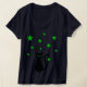 Ein Silhouette Cartoon einer schwarzen Katze mit grünen Augen. Ein grüner Stern hängt vom Schwanz der Katze. Ein Sternenhimmel von passenden Sternen ist vorne und hinten.