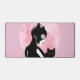 Mit diesem stilvollen Mauskissen mit einem geheimnisvollen Charakter in einem schwarzen Katzenkostüm mit einer schwarzen Katze heben Sie Ihren Arbeitsbereich auf. Set vor einem weichen rosa Hintergrund und einem traumhaften Mond verbindet dieses Design niedliche und gotische Ästhetik - ideal für Katzenliebhaber, Animateure oder alle, die gemütliche, kreative Schreibtischaufnahmen genießen.