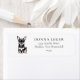 Niedliche, glückliche, lächelnde Chihuahua Hundeillustrierung. Bereit, Ihren personalisierten Namen und Ihre Adresse mit einem modernen Schriftart hinzuzufügen. Einfaches und Minimalistisches Design. Tri Farbe, schwarz, tan, und weiß Chihuahua.