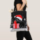 Im Weihnachtsdesign findet man eine schwarze Katze, die mit einer roten Weihnachtsmannmütze geschmückt ist und neben einem rot-weiß verpackten Weihnachtsgeschenk auf einem schwarz-weißen Winterwunderland mit Bäumen und Schnee sitzt.
