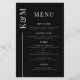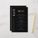 Elegante Speisekarte für Hochzeitsessen mit einer einfachen, sauberen Linie, die den ersten Eindruck des Ehepaares auf der Seite vermittelt. Der Hintergrund ist schwarz.